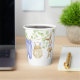 Tasse en papier pour baby shower, décorée avec de belles illustrations aquarelle de vêtements de bébé mignons accrochés sur une ligne à sécher, un mignon lapin farci entouré de branches délicates avec des feuilles vert clair.