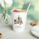 Ces tasses en papier rustiques et douillettes de fêtes de fin d'année présentent une aquarelle illustrant un mignon gnome féminin assis à côté d'un arbre de Noël miniature, d'un panier de billes de bouleau et de quelques bougies. Les mots "MERRY CHRISTMAS" apparaissent dans des lettres serif grises qui se coordonnent avec l'art. Ajoutez le nom de votre famille en italique gris charbon.