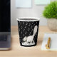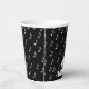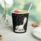Ces tasses en papier sont noires avec des notes musicales blanches et un chat blanc qui vole et qui marche à travers les touches de piano noir et blanc.