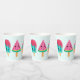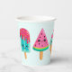 Tasses en papier avec une illustration de 3 friandises différentes à la crème glacée. Un coquelicot bleu-vert avec des gouttes de fraises et des arrosages colorés. Un popsicle de pastèque. Un cône avec des couches de délicieuses glaces en rose et menthe. Tous avec mignon kawaii sourit.