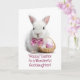 Happy Easter to your goddaughter—a cute little white bunny holding a tiny basket filled with colorful eggs.
