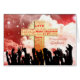 Une carte de Noël pour votre filleul. Une carte de Noël très différente. Des foules qui applaudissent se serrent les mains devant une croix d'or. La croix est inscrite en rouge avec les salutations de Noël et les phrases. Dans l'arrière - plan est un ciel rouge avec des foules tourbillonnantes et des étoiles. Envoyez un message religieux ce Noël avec une carte qui exsumera le bonheur.