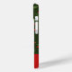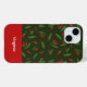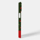 Ein Telefongehäuse mit einem Muster von Goji-Beeren auf dunkelgrünem Hintergrund und einem anpassbaren Vornamen unten auf einem roten Hintergrund. Ein hübsches Geschenk für einen Freund, der Beeren Lieben.