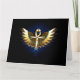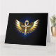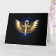 Golden ägyptischer Knöchel mit gemusterten, glänzenden Flügeln auf schwarzem Hintergrund. Magisches Symbol.