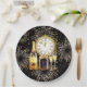 Feierliche 2023 Neujahrsfeier Party Teller mit Champagnerbrille und Uhr nahe Mitternacht.