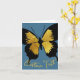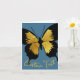 Blickfang Schmetterling im Flugdesign mit goldfarbenem, individuellem Text für einen Namen oder eine Nachricht. Das Design zeigt eine Abbildung eines Schmetterlings mit kontrastierenden glänzenden gelben und schwarzen Streifen. Die Flügel sind ausgestreckt, auch in den gleichen Farben Schwarz und Gold. Der benutzerdefinierte Text ist in einem kalligraphischen Stil, kurvt um den Schmetterling in einem hellgelben Gold. Dieses schlichte Schmetterlingsdesign ist Set vor einem denim blauen Hintergrund.