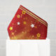 Weihnachts-Gewebe-Papier-Design mit goldenen Sternen, Glitzern und Lichtern auf einem roten Hintergrund.