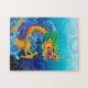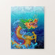 Ein schöner Golddrache im chinesischen Stil auf blauem Hintergrund wirbelnder Wellen.