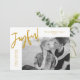 Freuen Sie sich auf eine Freude an Ihrem Aufenthalt mit einer einfach fröhlichen Urlaubskarte von Late Bloom Paperie! Die moderne Urlaubskarte bietet "Joyful" in einem goldenen, handgeschriebenen Pinselskript. Personalisieren Sie die Vorderseite der Karte, indem Sie Ihr Foto, Ihren persönlichen Gruß, Familiennamen und das Jahr hinzufügen. Die Karte kehrt sich um, um ein goldfarbenes und weißes diagonales Streifen-Muster anzuzeigen.