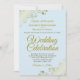 Diese schöne Hochzeitseinladung ist stilvoll, einfach und elegant. Es zeichnet sich durch goldene Schriftzeichen auf einem blass pulverblauen Hintergrund aus, in jeder Ecke mit floralen Imitat-Filigree. Das schlichte Design wird durch die verzierten Falten und Wirbel des Kunstwerks ausgeglichen. Der Rücken hat einen individuell anpassbaren QR-Code und einen Detailhinweis, sodass Sie Ihre Gäste zu einer Website für Informationen und UAWG leiten können.