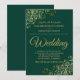 Diese einfache und elegante Hochzeitseinladung mit goldenen Schriftzeichen auf einem dunkelgrünen Hintergrund. Das Design ist schlicht, aber die Ecken sind mit einer verzierten Imitat-Folie floralen Filigree mit Rollen und Falten versehen. Der Text ist formell und traditionell, aber das schicke Design macht diese Einladung für jede Hochzeit geeignet.