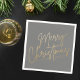 Fröhlicher Weihnachtstext in extravaganter Schrift in goldenen Imitate-Folie ist auf grauem Urlaubspapier Servietten zu sehen. PAPIERE Teller und mehr in unserem Geschäft.