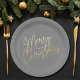 Fröhlicher Weihnachtstext in extravaganter Schrift in goldener Imitat-Folie ist auf silbergrauen Urlaubspapier-Tellern in zwei Größen zu sehen. PASSENDE Artikel in unserem Geschäft.