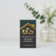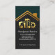 Das Design verfügt über ein vergoldetes Gebäude-Dach mit einer Reihe von handwerklichen Goldwerkzeugen. Darunter befindet sich der Firmenname "Handyman Service", gefolgt von den Kontaktdaten und einem Slogan, den Sie ändern können. Auf der Rückseite, in einem dunkelgrünen Cover, oben ist das goldene "Zuhause-elektrische Säge"-Logo, das Sie verwenden können. Darauf folgen der Firmenname, die Kontaktdaten und die Slogan-Beschriftung. Eine Visitenkarte für Handwerker-, General- und Gebäude-Auftragnehmer.