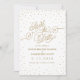 Winzige, glitzernde Goldsterne funkeln in Konfetti-Wolken um den Rand dieser wunderschönen, weißen und goldfarbenen Save the Date Karte, mit einem goldenen Glitzer-Effekt-Skript, das "Save the Date" liest. Extravagant, schick und bezaubernd auf einmal. Original-Kunstwerk von Colleen Michele. Bitte beachten Sie, dass auf den Sternen und dem Drehbuch kein echter Glitzer- oder Goldblatteffekt zu sehen ist; in dieser Einladung wird kein Glitzer, Goldblatt oder Metallfarbe verwendet.