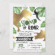 Gold Green Dinosaur Invitation d'anniversaire Vous cherchez une invitation audacieuse de dinosaure pour la fête d'anniversaire de votre petit garçon? Ce design présente deux silhouettes de dinosaures dorées, bannière noire verte tropicale et tête verte et verte. C'est une façon cool d'invitation des amis et de la famille de votre petit garçon à sa fête d'anniversaire sur le thème du dinosaure.
