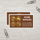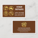Eine braune Schicht ist durch einen weißen rechteckigen Rand eingekapselt. Zu den verlassen Werkzeugen der Karte gehören vier goldene Handyman-Werkzeuge; die Werkzeuge können einige der Dienstleistungen darstellen, die Sie anbieten können, z.B. das Bohrband kann das Umbauen von Zuhause darstellen, den Wasserhahn für Installationen, den Power für Elektroinstallationen und die Bürsten für die Zuhause-Malerei. Oben rechts ist der Firmenname "ZUHAUSE REPAIRS", gefolgt von Ihrem Namen und den Kontaktdaten. Overleaf wird das gleiche Design-Thema verwendet. Oben ist ein goldenes handyman Tools Zuhause Logo, das Sie verwenden können, gefolgt von Ihrem renommierten Namen, die Kontaktdetails und eine Slogan-Option, um Ihre Dienste zu veröffentlichen. Ein großartiges Design für Gebäude-, Bau- und Handwerksbetriebe. #handyman #constuctionhandyman #homerepairtrader #construction #builder #remodeling #handymantools #buildingtragnehmer #homerepair #interiordesign #zazzlemade