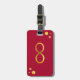 Gepäckanhänger mit goldenem Unendlichkeitssymbol und goldenen Punkten Konfetti auf bordeauxrotem Hintergrund. Name und Stadt sind bereit, personalisiert zu sein.
