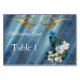 Gold auf dekorativer metallischer Smaragdgrüner Seide mit zwei Pfauen, Federn und weißen Blume, um diese Pfauenhochzeit oder Dekordesign zu passen, um die Zahl und Namen Karten für jede Quest auf dem Tisch zu personalisieren