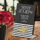 Mint Julep Plastik Fußbodenschild zeigt ein goldenes Rennpferd auf schwarz-weißen Streifen am unteren Ende und die Worte "Mint Juleps" und eine Liste der Zutaten. PASSENDE Artikel in unserer Sammlung.