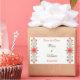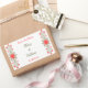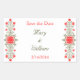 Un autocollant Save the Date personnalisé avec une imprimante vintage marque la gravure d'un bouclier décoré et un design floral de marguerites et de feuilles de curling en rouge et en or, restauré à partir d'un manuscrit antique.