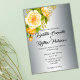 Eine wunderschöne, goldene Blumen- und Silberhochzeit lädt mit einem Bouquet prächtiger gelber Rosen in der links oberen Ecke auf einem silbernen Metallic ein. Alle Details können leicht in Anzug geändert werden, indem Sie einfach auf den Link Diese Vorlage personalisieren oben klicken. Die Rückseite der Einladung hat den gleichen silbernen Hintergrund, mit dem goldenen Rosenbukett in der Mitte.