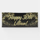 Hübsches hübsches Gold und schwarze festliche personalisierte Geburtstags-Partyfahne ummauern Dekoration. Hervorragende Geburtstagsfahnengewohnheit gedruckt mit den Ehrengastmännern oder -Frauen Namens! Feenhafter Staub des Schwarzen und des Goldes, bokeh und Strahlen des Lichtes, zum des speziellen Meilensteingeburtstages des Ehrengasts zu feiern!