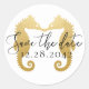 Elegante und moderne goldkissende Seepferde Strand Hochzeit Save the Date Aufkleber für ein schicke und elegante Strand Thema Hochzeit oder Einladung.