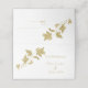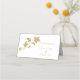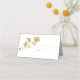 Ein Gold Single Stiel Leaf Form für einen Namen und Tischnummer Platz Inhaber. Text und Bilder auf beiden Seiten.