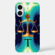 Elegantes Gerechtigkeitssymbol ,künstlerisch.Klassische goldene Waagen mit lila 3D-Edelsteinen , leuchtenden Lichtern und Fraktal-Wellen in Aquablau, Türkis, aquamarin Gelb, Weiß . Digitale Kunst von Bulgan Lumini (c).