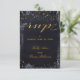 Une carte d'encastrage R.S.V.P. faire-part de mariage noir et or avec une aquarelle noire avec des taches d'encre dorée, qui rappelle un ciel nocturne au milieu d'étoiles dorées scintillantes. Une calligraphie classique en or anglais pour vos noms avec des petites lettres bloc pour les détails.