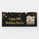 Feiern Sie jeden Geburtstag (für einen 80. Geburtstag) für ihn oder sie mit diesem farbigen Foto-Banner-Zeichen mit einem goldenen Sternenrahmen und personalisiert mit einem Bild und Ihrem eigenen Text (das Beispiel schlägt HAPPY # BIRTHDAY NAME in einem bearbeitbaren modernen, kalligraphischen Skript) auf einem bearbeitbaren schwarzen Hintergrund. Das Beispiel wird in einem 2.5x6' Indoor-Banner gezeigt - andere Größen oder "Outdoor" Option finden Sie auf der Bestellseite. HILFE: Für Hilfe bei der Modifikation/Personalisierung des Designs, bei Farbänderungen, bei der Übertragung des Designs auf ein anderes Produkt oder wenn Sie die Dinge koordinieren möchten, wenden Sie sich bitte an den Designer, BEVOR er die Bestellung über die Registerkarte Zazzle Chat MESSAGE oder per E-Mail an makeitaboutyoustore@gmail.com.