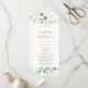 Dieses Hochzeitsprogramm beinhaltet gemalte Aquarellfarben Eukalyptus, botanisch grüne und goldene Glitzer-Blätter mit Goldschrift.