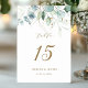 Diese Hochzeitsfeier Tischnummer zeigt malte Aquarellfarben Eukalyptus, botanisches Grün und Gold Glitzer Blätter mit Goldschrift.