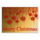 Eine goldene Weihnachtskarte mit einem Spur von roten Weihnachtsdekorationen und Sternen, die über der frohen Weihnachtsbotschaft hängen.