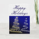 Diese Bäume sind weiß und goldfarben mit leuchtenden weißen und goldenen Sternen. Dies geschieht auf einem blauen Hintergrund. Dieser Stil ist in verschiedenen Grußkarten erhältlich. Passen Sie sich mit Ihren eigenen Informationen an.