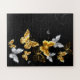 Gold, Schmuck und weiße Schmetterlinge auf schwarzem Hintergrund. Goldener Schmetterling.