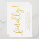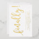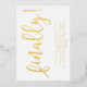 Eine minimalistische typografische Einladung. In diesem Design steht das Wort "endlich!" in fett gedruckter Goldfolie handschriftlich Schriftart und Party Details in modernen Sans Serif Schriftart, alles auf einem weißen Hintergrund.