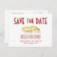 Rot, Weiß und Gold Modern Einfache Save the Date Postkarten mit Foto von goldenen Hochzeitsringen. Passen Sie Ihre persönlichen Informationen zur Hochzeitsankündigung an. Ein schönes, elegantes Design mit lustigen Schriftart-Stilen für Text kombiniert mit zwei gelben und silbernen Hochzeitsbands.