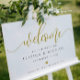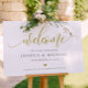 Begrüßungsschild, Begrüßungsschild, Begrüßungsschild, Begrüßungsschild, bedrucktes Schild, Schild, Veranstaltungsschild, Vorhänge, Vorzeichen, elegantes Hochzeitszeichen, schicke Hochzeiten, Goldhochzeit, goldenes Herz
