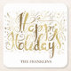 Untersetzer "Happy Holidays" in Gold und Weiß mit einem Familiennamen.