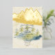 Eine wunderschöne Hochzeitseinladung mit goldenem Hintergrund und grünen und blauen Fichten im Vordergrund