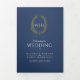 Dunkelblau handgezeichnet ovale Blätter botanische Kunst Kranz mit Monogramm Hochzeitsprogramm mit Ihrer eigenen Liebe Geschichte und Erinnerung Sektionen. Personalisieren Sie dieses Dreifachprogramm mit Ihren eigenen Trauungsdetails, Party-Namen, Foto- und Liebe-Geschichte und Widmung. Einfaches, ovales Design mit eigenen Monogramm-Initialen in Gold und Blau. Andere Farben und passende Hochzeitsartikel sind erhältlich. © Original Blatt Hand zeichn und Design von Sarah Trett für www.mylittleedenweddings.com auf Zazzle.