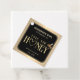 Einfache und dramatische Honigmarke mit goldenem Farbverlauf und einer fliegenden Honigbiene auf schwarzem Hintergrund. Ein goldenes Herz ersetzt den Buchstaben "O" im Wort HONEY. Fügen Sie Ihren benutzerdefinierten Text auf der Rückseite ein.