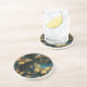 Ein eleganter Untersetzer aus Sandstein mit einem Schmetterlingsmuster in glitzernden goldenen Farbtönen und leuchtender Blues.