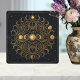 Embrace the mystical allure of the cosmos with this stunning ceramic tile, featuring a golden celestial design of the luna phases and alchemical harmony. The intricate circular mandala showcases the waxing and waning of the moon, set against a dark, star-speckled background. This unique artwork brings a touch of ancient wisdom and celestial beauty to any space, perfect for those drawn to astrology, mysticism, and the natural cycles of the universe. Its rich golden details and symmetrical pattern create a captivating focal point, ideal for adding a touch of magic to your home decor. Enhance your walls with this elegant representation of lunar cycles and cosmic balance.