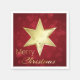 Ein goldener Stern mit Schneeflocken auf einem roten Background und fröhlichem Weihnachtskalligrafietext.