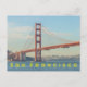 Die ikonische Golden Gate Bridge in San Francisco wird in einem atemberaubenden Foto aufgenommen. Die Brücke, in einer lebhaften orangefarbenen Farbe gestrichen, erstreckt sich über die Bucht, die Seilzüge bilden ein Netz aus komplizierten Mustern gegen den klaren blauen Himmel. Das Wasser darunter ist ruhig, tiefblau und reflektiert das Sonnenlicht.