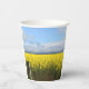 Unter einem teilweise bewölkten Himmel erstreckt sich ein hellgelbes Blumenfeld, in dem in der Ferne Berge zu sehen sind. Ein Holzzaun im Vordergrund verleiht der Landschaft eine rustikale Touch. Dieses Bild wurde in der Nähe von Ararat in Victoria, Australien aufgenommen.