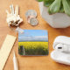 Unter einem teilweise bewölkten Himmel erstreckt sich ein hellgelbes Blumenfeld, in dem in der Ferne Berge zu sehen sind. Ein Holzzaun im Vordergrund verleiht der Landschaft eine rustikale Touch. Dieses Bild wurde in der Nähe von Ararat in Victoria, Australien aufgenommen.